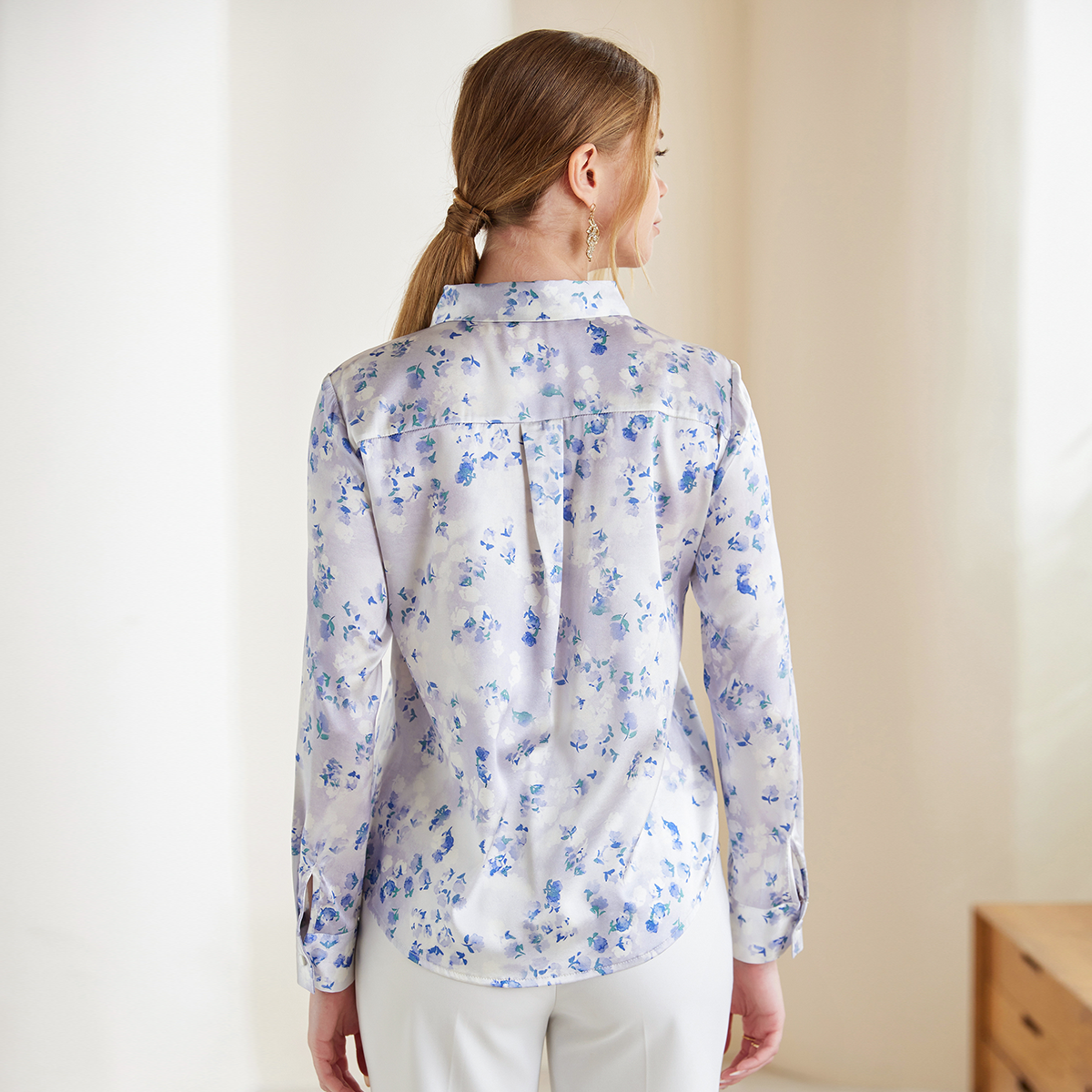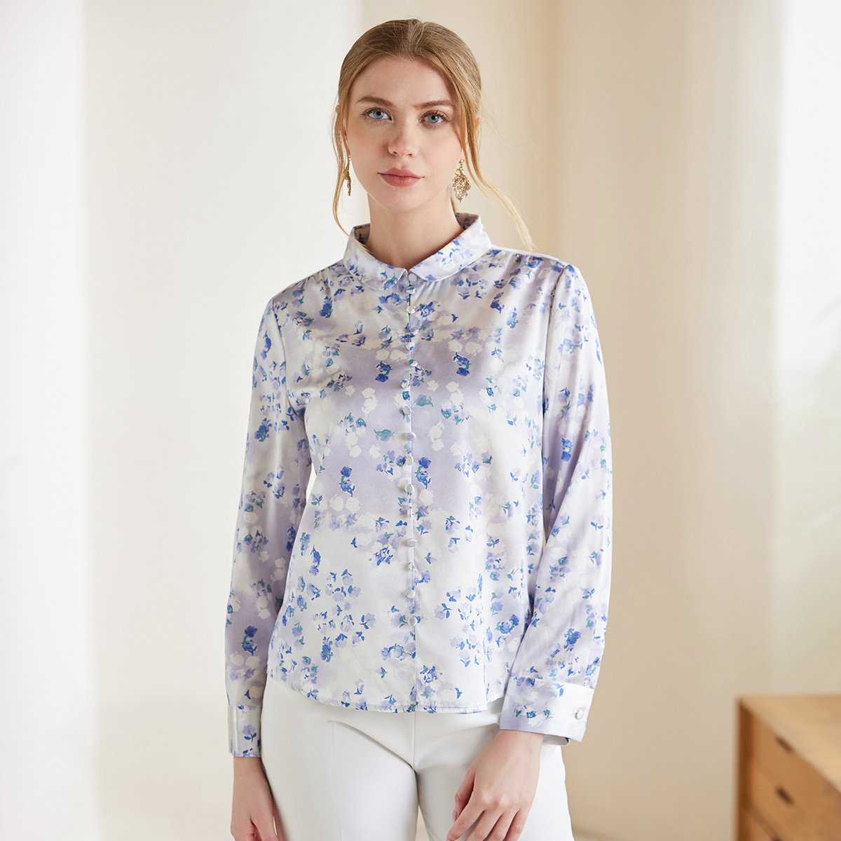 Ce chemisier en soie naturelle et élastique captive par son imprimé floral subtil et son col Peter Pan raffiné. Les boutons nacrés sur la poitrine ajoutent une touche de sophistication discrète, tandis que la coupe fluide épouse le corps sans le contraindre. Conçu pour les femmes actives, il s’adapte aussi bien à un pantalon tailleur qu’à une jupe midi, alliant élégance intemporelle et confort au quotidien.